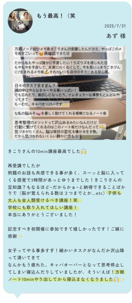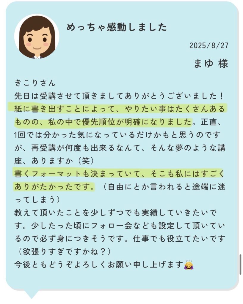 10分でやること・やりたいことが整理できて今まで悩んでいたことはなんだったんだろうと感じます。難しい講座だと思っていましたがとても簡単で驚きました。